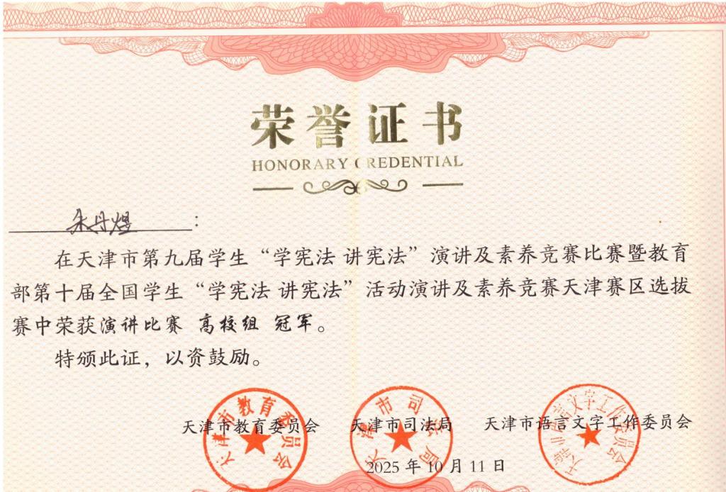 10月11日,由天津市教育委员会、天津市司法局、天津市语言文字工作委员会联合主办的第十届全国学生“学宪法 讲宪法”演讲及素养竞赛天津赛区选拔赛圆满收官。我校政治与行政学院2023级本科生朱丹煜从全市各高校优秀选手中脱颖而出,荣获高校组冠军。