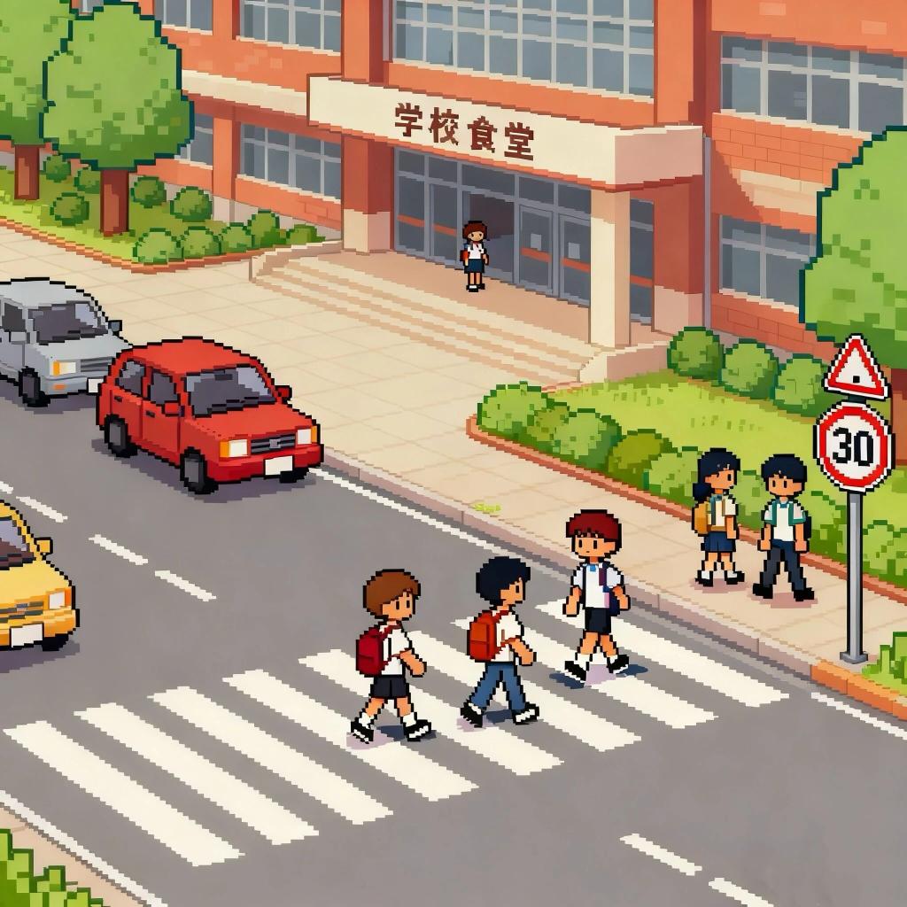 学校限速30km/h,别觉得“路宽就能加速”——说不定转角就有跑跳的小朋友,或者突然横穿马路的同学!