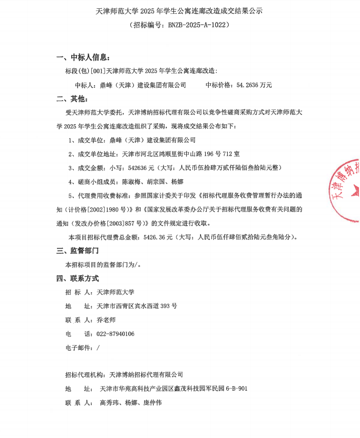 天津师范大学2025年学生公寓连廊改造成交结果公示