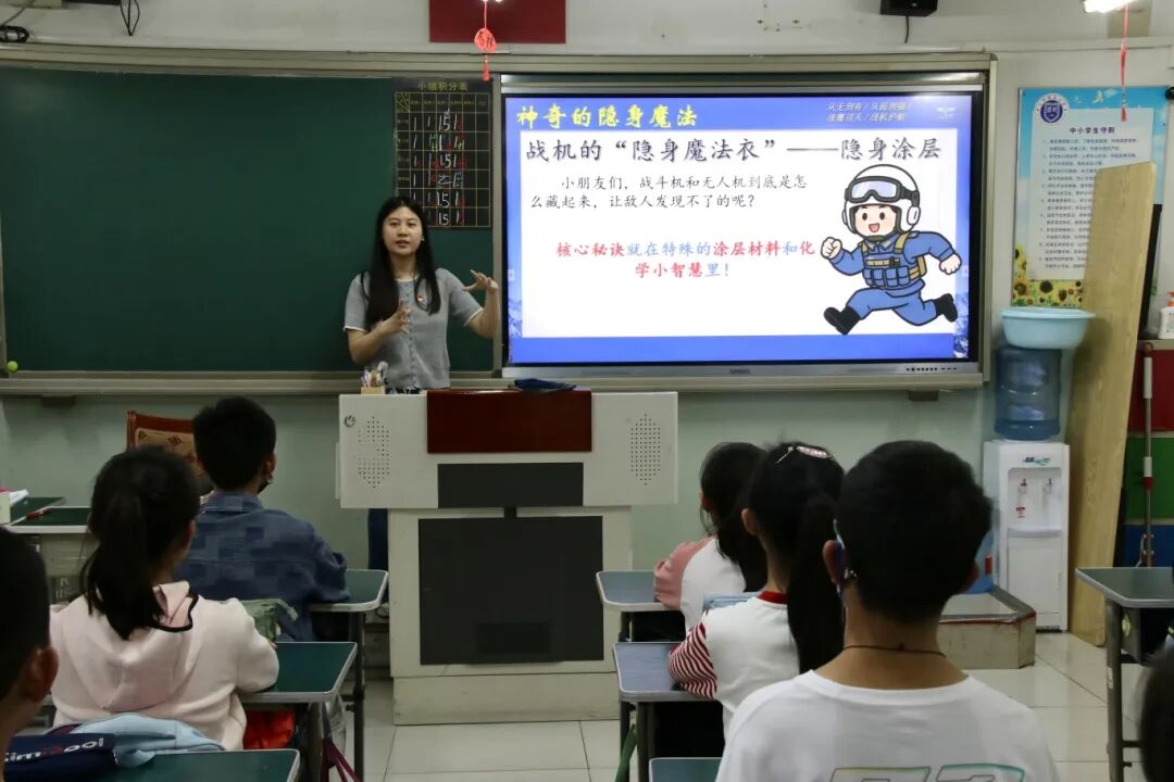 依托化学专业特色,党员们还带来了趣味航空知识科普,从隐身战机的“隐身涂层”,到被誉为“工业维生素”的稀土材料,将材料化学与国防科技紧密相连,让小学生们在了解大国重器的同时,感受科技背后的化学力量。